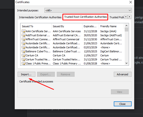 4- Clique na opção de "import" em "trusted roots certification authoroties"